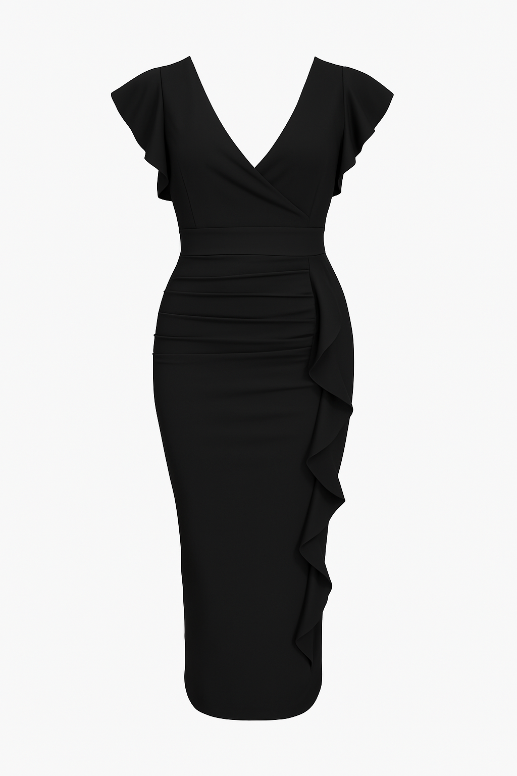 Denna bodycon klänning är utformad för att ge en smickrande silhuett med en slimmad passform. Volangdetaljer och fjärilsärmar ger en mjuk visuell kontrast som passar bra för vår- och sommarsäsongen. Klänningen fungerar väl vid både formella och halvformella tillfällen.
