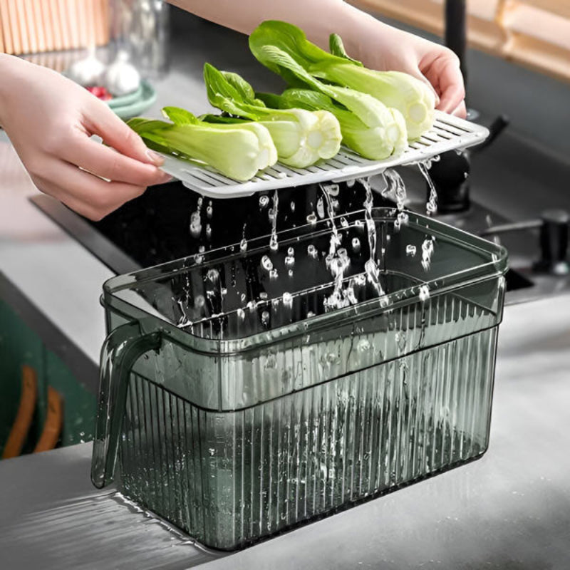 Denna förvaringslåda är avsedd för kylförvaring av olika livsmedel. Designen gör innehållet synligt och lådan kan staplas tillsammans med andra enheter. Den kan användas för grönsaker, snacks, såser eller kryddor.