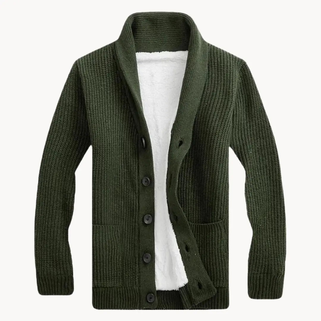 Denna herrkofta med sjalkrage har en tidlös design som passar både till vardag och fritid. Den ribbade strukturen och de svarta knapparna ger en diskret och stilren look.