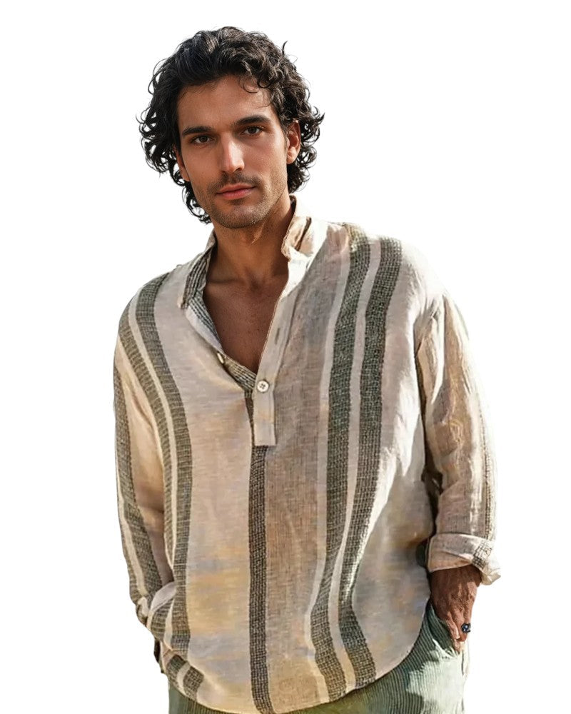 Denna skjorta har ett randigt mönster och en ståkrage som ger en stilren men ledig look. Den fungerar bra både till vardags och när du vill vara lite mer uppklädd under varmare dagar.