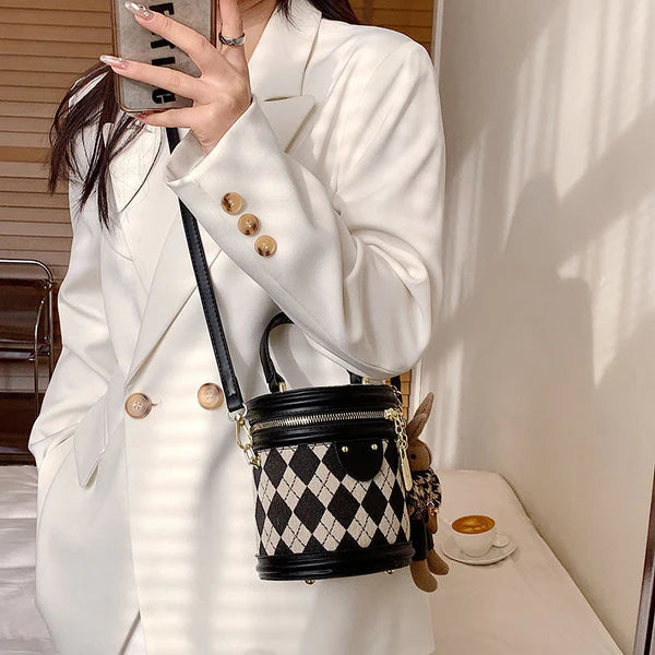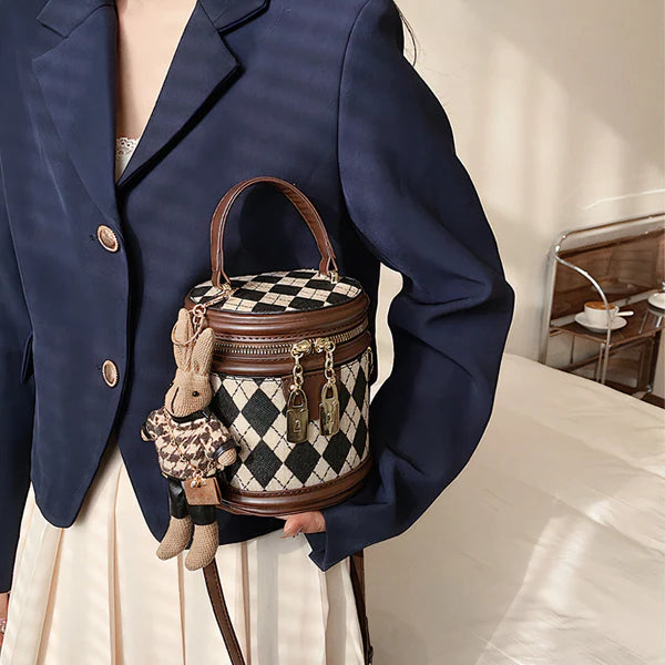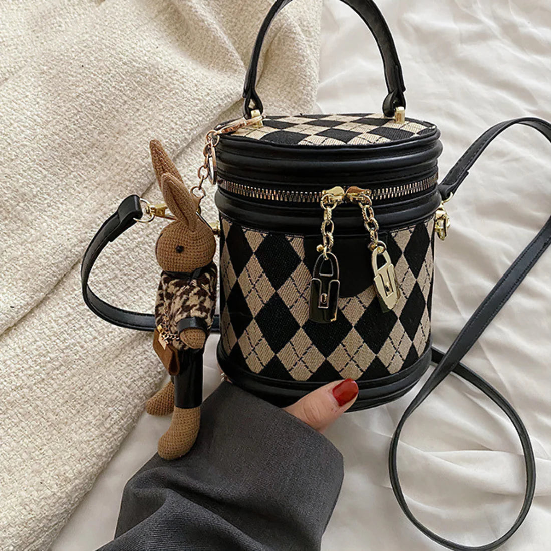 Denna runda axelväska kombinerar en modern design med en kompakt storlek, perfekt för vardagliga ärenden eller en kväll ute. Den justerbara axelremmen ger flexibilitet, medan den dekorativa kaninberlocken tillför en unik detalj. Väskan har en säker dragkedjestängning och en inre ficka för din mobiltelefon eller andra småsaker.