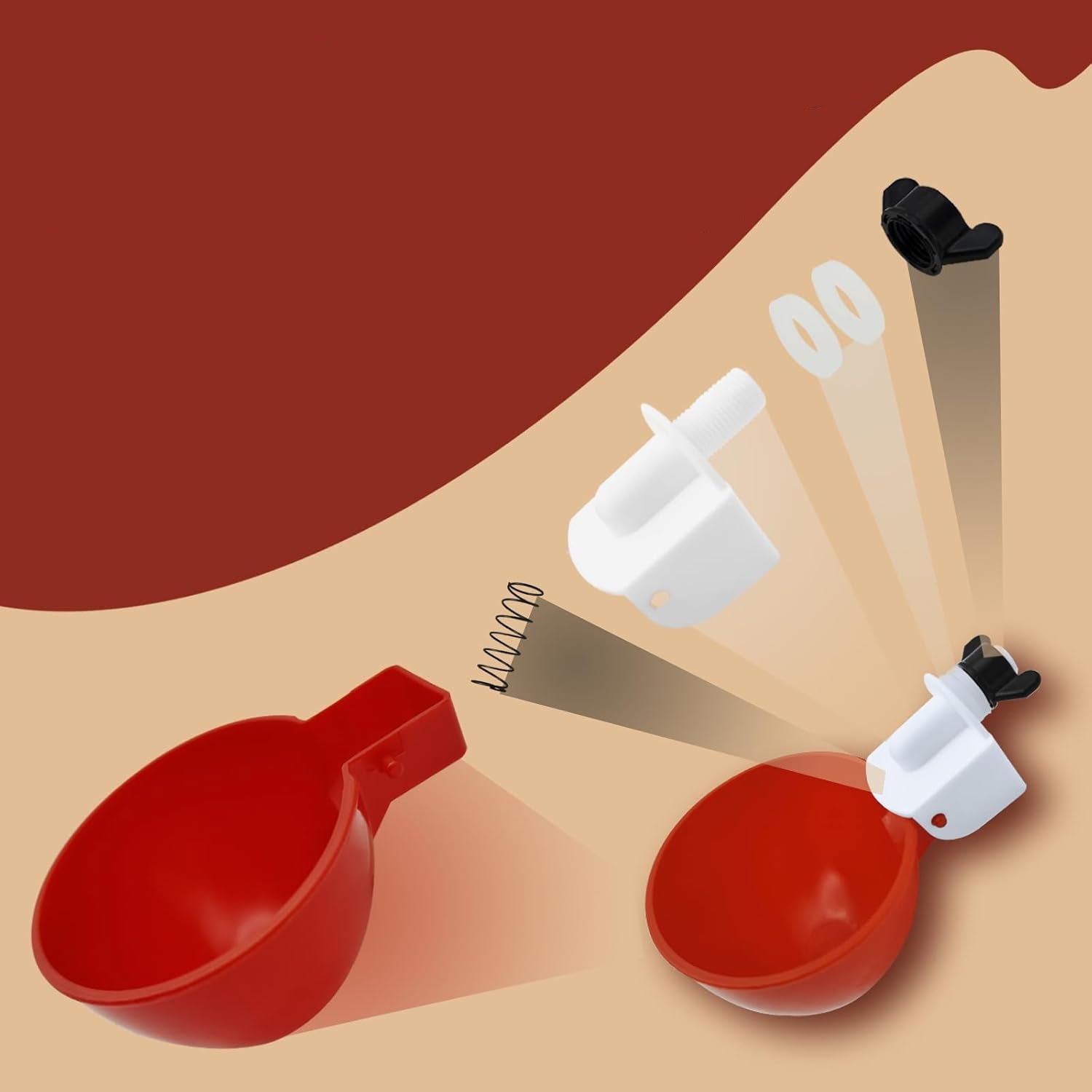 Denna höns vattenautomat fyller automatiskt kopparna med vatten. Systemet använder en gravitationsbaserad fjädring som öppnar ventilen när vattnet blir lågt och stänger när det är fullt, vilket minskar spill och underlättar vattning av fjäderfän.